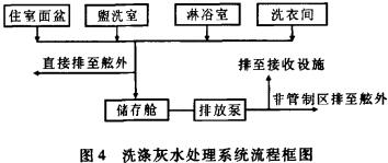 2)在水質(zhì)排放受限制的水域,洗滌灰水送入灰水儲存艙儲存,在港口洗滌灰水可以通過國際通岸接頭排至碼頭接收設(shè)施活接收船,在航行中可在水質(zhì)不受限制水域再排至舷外。