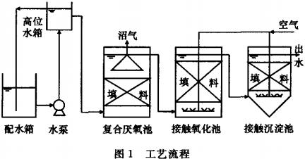 原水經(jīng)泵提升至高位水箱后恒定出流,首先經(jīng)UBF截留SS,通過水解酸化將難降解、大分子物質(zhì)轉(zhuǎn)化為易降解、小分子物質(zhì);出水經(jīng)接觸氧化反應(yīng)將大部分有機(jī)物轉(zhuǎn)化為CO2和H2O;最后經(jīng)接觸沉淀池進(jìn)一步降解部分有機(jī)物,并實(shí)現(xiàn)泥水分離;分離出的老化生物膜定期回流至水解池進(jìn)行水解、消化,最終實(shí)現(xiàn)泥、水的一體化處理。