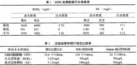 為檢驗(yàn)?zāi)ど锓磻?yīng)器污水處理工藝處理船舶污水的效果,Hamworthy公司于2000~2001年在“太陽(yáng)公主”號(hào)上對(duì)膜處理效果進(jìn)行了為期31天的測(cè)定。處理對(duì)象是船上的灰水和黑水。在平均日處理量為52927L的情況下,MBR處理效果如表1所示,試驗(yàn)結(jié)果和現(xiàn)行規(guī)范比較結(jié)果列于表2。