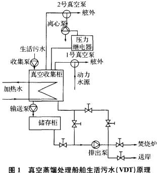 舶生活污水-VDT處理技術(shù)利用造水機原理和船舶廢熱,將船舶生活污水中的液體部分蒸發(fā)成水蒸汽后直接排出,而且無需冷凝,這樣既簡化了裝置和操作,又不要提供冷凝海水(節(jié)能)。而留下的固體物在船利用焚燒爐焚燒掉或可作為有機肥料送岸,從而達到船舶生活污水零排放的目的。為了將造水機原理與生活污水處理結(jié)合起來,并使整個裝置更加緊湊,生活污水的收集必須采用真空收集法兩者結(jié)合后的VDT裝置原理見圖1。