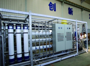 集裝箱里的機器,是一臺大型凈水裝置,從災區(qū)江河湖泊里抽上來的水,在這里經(jīng)過超濾—反滲透凈化處理,每小時流出1噸,比桶裝的純凈水質(zhì)量還要高。