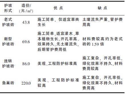 通過對現(xiàn)在護坡中使用連鎖護坡磚、生態(tài)混凝土、各類噴播、魚巢磚等技術(shù)的材料成本、施工成本和后期管護等綜合成本分析(見表2),新型護坡磚有著更強的優(yōu)勢、有廣闊的應(yīng)用前景和推廣價值。