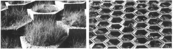 在實際應(yīng)用中與老式護坡磚配合的植被措施以種草或鋪草皮為主,雖然也有采用沙地柏、連翹、地錦等植物進行景觀綠化,但灌木的樹冠截流效應(yīng)會在根部造成磚內(nèi)土壤的加速流失,不利于水、肥的保持,造成灌木和草生長的立地條件差,且可選擇的植物配置形式單一,影響綠化效果,無法發(fā)揮植物的蓄水保土作用。