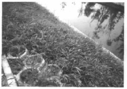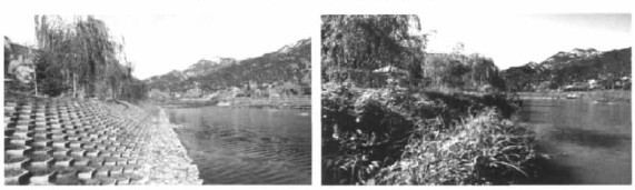 2010 年對懷柔區(qū)寶山寺鎮(zhèn)碾子村生態(tài)清潔小流域治理工程的河道治理項目監(jiān)測表明,坡面植被覆蓋度達(dá)95%以上,減少土壤流失90%以上,(見圖8)。由于坡改平特殊的保水結(jié)構(gòu),各類植物生長迅速,試驗區(qū)內(nèi)的植物由1 種人工綠化的黑麥草發(fā)展到野生的酸模葉蓼、葎草、莧菜、木麻黃、水芹等13 種植物,植物群落中植物種類豐富,野生植被演替速度明顯超過傳統(tǒng)護坡措施。保土效益和綠化效果非常顯著;通過調(diào)查訪問,該措施可減少后期管理投入90%以上。