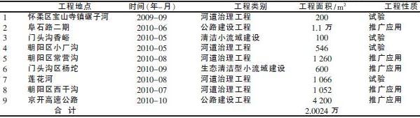 2010 年,“坡改平”生態(tài)護坡技術(shù)先后在北京市阜石路二期工程西六環(huán)立交橋區(qū)護坡、朝陽區(qū)小廠溝河道生態(tài)治理、朝陽區(qū)常營中心溝河道生態(tài)治理和京開高速公路求賢收費站立交橋區(qū)等工程中得到應(yīng)用(見表3) ,涉及河道治理工程、公路建設(shè)工程、生態(tài)清潔型小流域建設(shè)工程等。