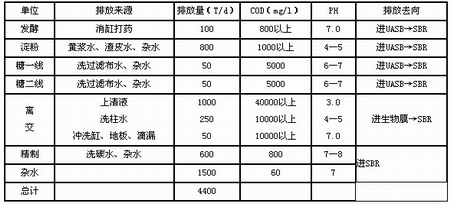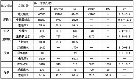 該廠處理的廢水主要為離交尾液;淀粉、制糖中的有機(jī)廢水,以及車(chē)間來(lái)的精制廢水,洗柱水及其他雜水。具體水質(zhì)水量見(jiàn)表1