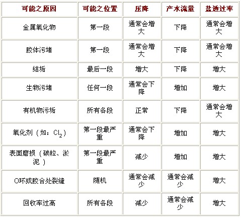 有可能的話,測(cè)量每段產(chǎn)水水質(zhì)及每支壓力容器產(chǎn)水水質(zhì)。有些污染物會(huì)污染系統(tǒng)前半部分;另一些污染物會(huì)污染系統(tǒng)后半部分。使用RO系統(tǒng)故障分析表(附后)可以幫助確認(rèn)污染物的種類。