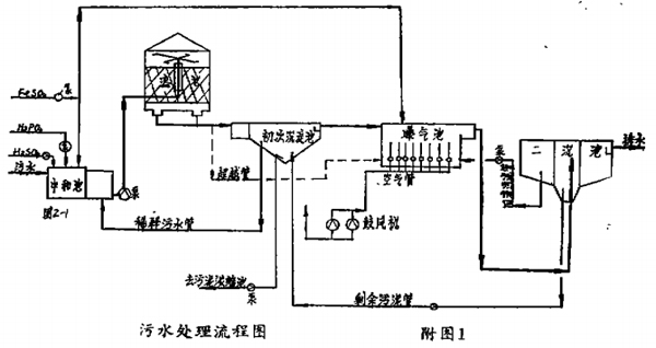流程一主要內(nèi)容是碳化硝化脫氮的活性污泥法與氨氮吸附相結(jié)合的工藝流程曝氣裝置采用高效微孔曝氣,由于面積較大能起到一定的吹脫作用。