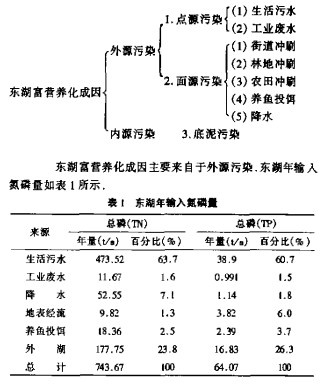 東湖富營養(yǎng)化成因主要來自于外源污染。東湖年輸入氮磷量如表1所示。