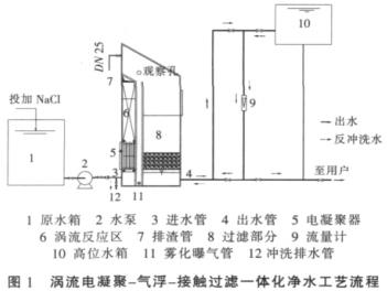 渦流電凝聚-氣浮-接觸過濾一體化凈水工藝流程如圖1所示。