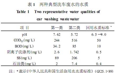 從表1中可以看出,兩種洗車(chē)廢水的污染程度不同,除洗滌劑外,第二類(lèi)廢水的各項(xiàng)污染指標(biāo)均高于第一類(lèi)廢水,這就決定了兩種水質(zhì)處理側(cè)重點(diǎn)的不同。第二類(lèi)廢水處理要加強(qiáng)相應(yīng)的除油措施。污染程度高,特別是有機(jī)物、陰離子洗滌劑、懸浮物含量高,則是各類(lèi)洗車(chē)廢水的共同特征。