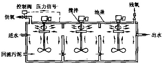 為了充分利用氧氣,曝氣是在一個加盞密封的池中進(jìn)行的,池子分為氣相部分與液相部分。為了使污水在池中形成穩(wěn)定性好的幾個完全的混合區(qū)段,根據(jù)表面曝氣機(jī)的作用半徑大小,將純氧曝氣池分成互相連通的格,呈一系列凹段。污水、氧氣、回流污泥均從池的第一段流入。通過設(shè)于每段隔墻上部(氣一液交界面處)的氣窗及設(shè)于池底部隔墻上的液窗,氧氣、污水及回流污泥的混臺液,分別依次流入其它各段。通過曝氣生物氧化作用,使污水中的BOD逐段降低,同時氣相中的氧純度也逐步降低,即B0D與氧濃度是等梯度下降的。這樣既有利于污水中需氧量的滿足,又有利于氧搗充分利用,使排出尾氣中氧濃度降到經(jīng)濟(jì)極限值。