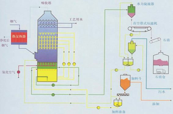 FGD裝置的核心是噴淋式吸收塔。煙氣從吸收塔中部進入,入口在吸收塔漿池最高液位上部和最低一層噴淋層下部之間。在吸收塔內,煙氣與頂部噴淋下來的石灰石/石膏漿液逆流接觸,被冷卻到絕熱飽和溫度,煙氣中的SO2和SO3與漿液中的石灰石反應,形成亞硫酸鈣和硫酸鈣,亞硫酸鈣在吸收塔漿池中被氧化空氣氧化成硫酸鈣,過飽和溶液結晶生成石膏(CaSO4·2H2O)。煙氣中的HCl、HF也與漿液中的石灰石反應而被吸收。在吸收塔頂部的除霧器除去煙氣中帶入的水滴,凈煙氣在吸收塔頂部以飽和溫度離開吸收塔。