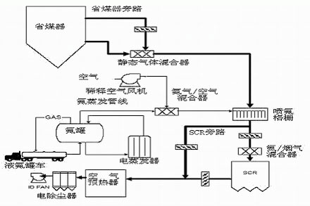 SCR工藝流程:還原劑 (氨) 用罐裝卡車(chē)運(yùn)輸,以液體形態(tài)儲(chǔ)存于氨罐中;液態(tài)氨在注入SCR 系統(tǒng)煙氣之前經(jīng)由蒸發(fā)器蒸發(fā)氣化;氣化的氨和稀釋空氣混合,通過(guò)噴氨格柵噴入SCR反應(yīng)器上游的煙氣中;充分混合后的還原劑和煙氣在SCR反應(yīng)器中反應(yīng),去除NOx。