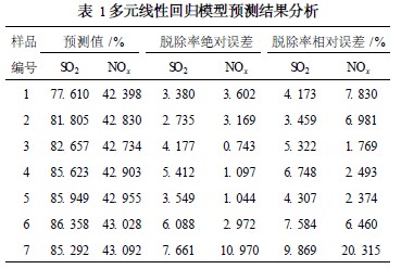 本文建立了TiO2 光催化同時(shí)脫硫、脫硝多元線性回歸模型。檢驗(yàn)結(jié)果表明,預(yù)測(cè)值與實(shí)測(cè)值平均絕對(duì)誤差小于5%,滿(mǎn)足精度要求。