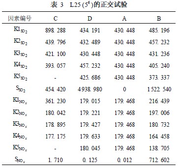 選取正交表L25 (56 ) ,將因素C虛擬1個(gè)水平, 據(jù)試驗(yàn)知, SO2 質(zhì)量濃度為1 000~2 000mg/m3 時(shí), 光催化效率最高,且恒定,所以虛擬硫氧化物濃度的第一個(gè)水平詳見(jiàn)表2。然后用所建立的模型進(jìn)行仿真計(jì)算,結(jié)果見(jiàn)表3。