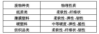 實驗樣品來自生活垃圾焚燒設備的破碎機,研究的對象為大于60 mm 的含有熱值的廢物,即薄膜塑料、硬塑料類、紙質類(普通紙、厚紙、紙箱類) 、紡織品類4 種,被研究的4 種廢物的物理性質見表1 。