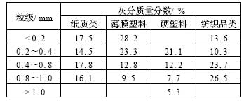 表2 是4 種廢物在不同粒級時測定的灰分結果。從表中可以看出,塑料類廢物(薄膜塑料和硬塑料) 灰分隨著顆粒粒度的增加有所下降,而紡織品類灰分的含量隨著粒度的增加而增加,紙質類廢物的灰分含量與粒度大小的相關性不明顯。
