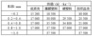 表3 是4 種廢物在不同粒級時測定的熱值變化特征。從表3 可以看出塑料類和紡織品類廢物隨著粒度的增加熱值也明顯地呈增加趨勢,而紙質類廢物增加不明顯。