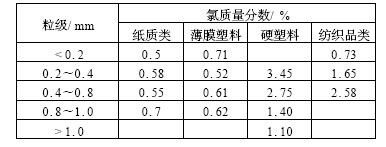 從表中可以看出,薄膜塑料、紙質類廢物氯的含量變化與粒級沒有明顯的關系,而紡織品和硬塑料有較明顯的變化。硬塑料氯的含量隨著粒度的增加明顯地降低,紡織品類氯含量隨著粒級的增加,氯的含量增加。