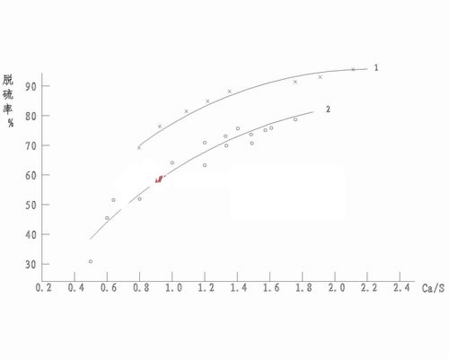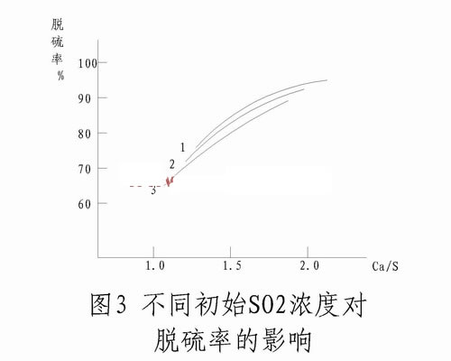 進口SO2濃度對脫硫率的影響,從圖3可以看出不同初始SO2濃度條件下,的脫硫率民Ca/S的實際曲線,由圖3可見初始SO2濃度越高,要達到較高的脫硫率越困難,其原因是在相同的反應(yīng)塔進、出口尾氣溫度和相同Ca/S條件下,高的進口尾氣濃度需要更多的新鮮石灰漿加入量。因此提高了霧滴中石灰的含量,增大了需要吸收的SO2量和生成的亞硫酸鈣量,霧滴水分的減少限制了Ca(OH)2與SO2的傳質(zhì)過程,使脫硫率降低。