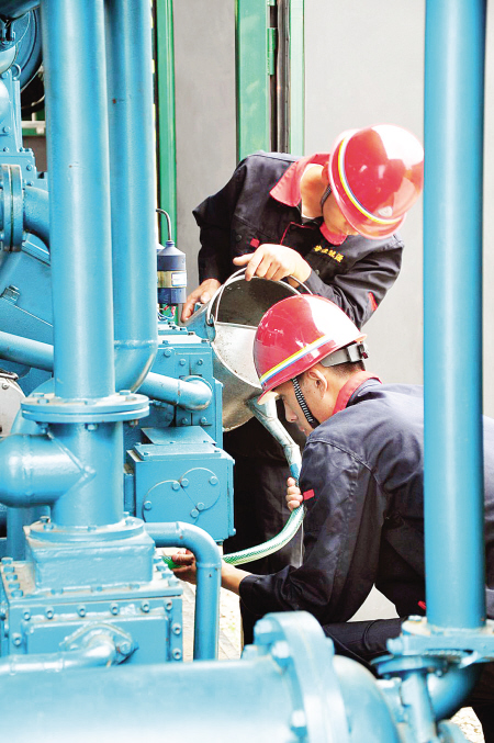 8月3日,黑龍江首家垃圾填埋氣發(fā)電項(xiàng)目——牡丹江市郭家溝垃圾填埋氣發(fā)電廠一期工程兩臺(tái)450千瓦時(shí)發(fā)電機(jī)組一次點(diǎn)火成功,順利并網(wǎng)發(fā)電。圖為工程技術(shù)人員為發(fā)電機(jī)組添加潤(rùn)滑油。