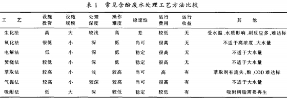 含酚廢水是一種來源廣、數(shù)量多、濃度高、環(huán)境危害大的水污染源,也是我國水污染控制中急需解決的重點問題之一。實驗和調(diào)查表明,在酚質(zhì)量濃度>0.1mg/L水中生長的魚類,其身體組織就會含有明顯的異味:當(dāng)水中酚質(zhì)量濃度>10mg/L時,魚類就無法生存;當(dāng)水中含酚>100mg/L時,用于農(nóng)田灌溉則會造成農(nóng)作物明顯減產(chǎn),甚至直接導(dǎo)致農(nóng)作物枯死。在過去幾十年里,人們對于含酚廢水治理技術(shù)的研究一直沒有停止過,形成了許多有價值的治理技術(shù)。這些技術(shù)包括:生化法、萃取法、氧化法、電解法、氣提法、吸附法和焚燒法等。這些技術(shù)的特點如表1所示。通過分析不難發(fā)現(xiàn),采用大孔樹脂作吸附劑的吸附法含酚廢水處理工藝具有投資低、適于大規(guī)模廢水處理、廢水處理深度較高、操作難度較低、穩(wěn)定性好、運行費用較低的顯著特點,而且在處理廢水的同時可以有效回收水中的酚,從而取得可觀的收益。