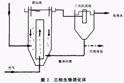 三相生物流化床是氣、液、固三相直接在流化床體內(nèi)接觸進(jìn)行生化反應(yīng),不另設(shè)充氧設(shè)備和脫膜設(shè)備,載體表面的生物膜依靠氣體的攪動作用,使顆粒之間激烈摩擦而脫落。其工藝流程如圖2所示[2]。三相生物流化床的充氧方式有減壓釋放空氣充氧和射流曝氣充氧等形式。三相生物流化床設(shè)備簡單,操作較容易,此外,能耗也較兩相生物流化床低。