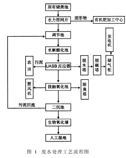 含有少量糞便的沖洗水經(jīng)收集自流入原有儲糞池,然后用泵打入固液分離裝置(水力篩網(wǎng)片),分離出的糞送至有機肥加工中心加工成有機肥出售。分離出的廢水自流入調(diào)節(jié)池,進行水量水質(zhì)調(diào)節(jié),而后用泵打入水解酸化池。在水解酸化細菌的作用下,把大分子有機物轉(zhuǎn)化為小分子有機酸,再用泵打入UASB反應(yīng)器。在UASB反應(yīng)器中,廢水中的小分子有機物(主要是有機酸)與微生物(主要是產(chǎn)甲烷菌)厭氧反應(yīng),使小分子有機物進一步斷鏈降解,在這個過程中產(chǎn)生的沼氣經(jīng)脫水脫硫處理后進入儲氣柜用于發(fā)電等。由UASB反應(yīng)器排出的廢水自流入接觸氧化池,與該池中的好氧微生物、兼性微生物和少量的厭氧微生物充分反應(yīng),使廢水中的有機物進一步無機化。反應(yīng)充分后的廢水自流入二沉池,在重力等作用下重力分離,污泥回流到調(diào)節(jié)池由前段工序進一步穩(wěn)定處理,上清液自流入生物氧化塘,進行進一步的物化和生物處理凈化。生物氧化塘的水最后流入人工濕地,在蘆葦?shù)戎参锔导爸車⑸锏淖饔孟碌玫匠浞值倪M一步降解,廢水經(jīng)人工濕地處理后達標排放或灌溉農(nóng)田。UASB反應(yīng)器設(shè)置有循環(huán)泵,當水質(zhì)波動大時啟動,提高升流速度,利于反應(yīng)器污泥處于高度膨脹狀態(tài),增加污泥與廢水的接觸面積,減少水質(zhì)波動對系統(tǒng)帶來的影響,提高反應(yīng)效率。二沉池的污泥連續(xù)回流到調(diào)節(jié)池中,有利于脫氮除磷。整個系統(tǒng)產(chǎn)生的污泥作為肥料由UASB反應(yīng)器定期排到附近農(nóng)田。人工濕地中的蘆葦定期收割出售。