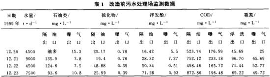 石家莊煉油廠污水處理場(chǎng)的構(gòu)筑物是80年代初建成的,是由隔油、浮選、曝氣池組成的“老三套”處理流程,設(shè)計(jì)處理能力為500t/h。生化處理設(shè)施為合建式表面曝氣池。在加工低硫原油時(shí),進(jìn)入污水處理場(chǎng)的污染物負(fù)荷較低,污水處理設(shè)施運(yùn)行基本正常。但是隨著原油性質(zhì)的改變、原油中硫含量不斷增加、深加工裝置陸續(xù)開工等等生產(chǎn)上的變化,造成了進(jìn)入污水處理場(chǎng)的廢水水質(zhì)發(fā)生變化,COD、氨氮等污染物負(fù)荷增大而且波動(dòng)較大,原有的構(gòu)筑物已經(jīng)不能適應(yīng)新的情況,特別是生化處理設(shè)施的運(yùn)行狀況不穩(wěn)定,實(shí)際處理能力較低,已經(jīng)不能保證達(dá)標(biāo)排放。為了提高污水處理場(chǎng)的抗沖擊能力和有機(jī)物降解能力,尤其是氨氮的降解能力,我們對(duì)污水處理場(chǎng)進(jìn)行了技術(shù)改造,增建了一座處理量為500t/h的三溝式ORBAL氧化溝為二級(jí)生化處理設(shè)施。經(jīng)過一段時(shí)間的運(yùn)行,污水處理場(chǎng)處理效果提高明顯。