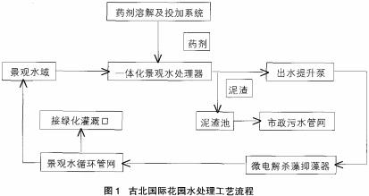 古北國(guó)際花園住宅項(xiàng)目于三年前竣工,基地面積為40398m,受兩層地下車(chē)庫(kù)影響,景觀水域外部形態(tài)及水深皆受限,水面積約為1440m,容量為560t,平均水深0.39m,水域底部為非底泥的硬質(zhì)隔水層。北端水體規(guī)劃為冬旱夏蓄,南端水體放養(yǎng)觀賞魚(yú),中段狹窄處設(shè)置五級(jí)跌水(北二南三),南北住兩處開(kāi)闊域深為0.4m,中間各跌落段及最低的水潭處深為0.3m,其落差為0.15m或0.2m兩種。由于水體采用分段越流形式,在設(shè)計(jì)循環(huán)系統(tǒng)時(shí)必須考慮水域中的處理水出水口與單循環(huán)水出水口的位置分布,以防止死角及回水區(qū)的產(chǎn)生而影響處理效果,此問(wèn)題于水處理方案確定后,根據(jù)技術(shù)計(jì)算及經(jīng)驗(yàn),綜合布管解決。