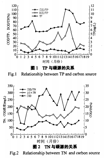 廢水生物脫氮除磷工藝中,有機(jī)基質(zhì)的種類、含量及其與微生物營(yíng)養(yǎng)物質(zhì)的比值是影響脫氮、除磷效果的重要原因。瓦房店龍山污水處理廠白運(yùn)行以來(lái)TP與碳源的關(guān)系見(jiàn)圖1,TN與碳源的關(guān)系圖見(jiàn)圖2。(圖中數(shù)據(jù)為2004年7月至2005年12月的由圖1可以看出,進(jìn)水中COD與p的質(zhì)量比均大于35,BOD與P的質(zhì)量比值大于15。保證了聚磷菌在厭氧條件下有足夠基質(zhì)而獲得良好的除磷效果。進(jìn)水COD不低于150mg/L,能夠達(dá)到生物除磷要求。