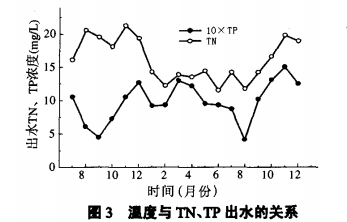 硝化作用和反硝化作用受溫度的影響很大,溫度高反應(yīng)速率快,溫度低則反應(yīng)速率低。由圖3可以看出溫度較低的10、11、12月出水的TN、TP相對(duì)較高。而7、8、9月份相對(duì)較低。