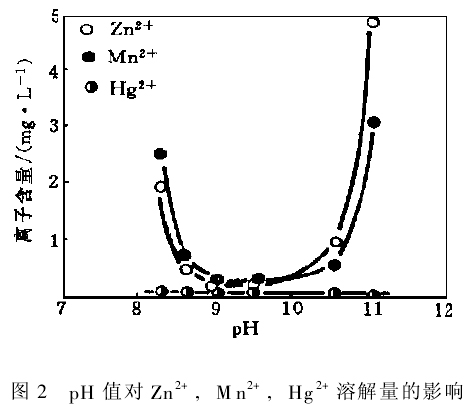 由圖2可知,在pH為8.0時,Zn2+,Mn2+在水中的含量較高。隨著pH值的增大,其含量逐漸變低,在pH為9.0時,Zn2+,Mn2+含量分別為0.10,0.15mg/L。.pH值繼續(xù)增大,Zn2+,Mn2+離子反而逐漸增高,當(dāng)pH為11.0時,Zn2+,Mn2+離子含量增加到5.0,3.0mg/L。產(chǎn)生這種情況的原因是由于Zn2+,Mn2+離子的氫氧化物能在OH-離子濃度較大的情況下生成相應(yīng)的配位陰離子Zn(OH)-3和Mn(OH)-3。.這些離子的溶度積分別為3×10-3及1×10-5,說明溶解度增大,使水液中的Zn2+,Mn2+含量增加,而Hg2+離子不具有這種性質(zhì),因此其含量較為穩(wěn)定。