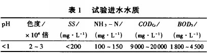 本研究所用的香料廢水取自某香料廠,該廠主要以愈創(chuàng)木酚,對(duì)亞硝基一N,N一二甲基苯胺和甲醛縮合的方法生產(chǎn)香蘭素,由于生產(chǎn)工藝復(fù)雜,產(chǎn)生廢水濃度高,且含有苯胺、硝基苯等難降解物質(zhì)。其水質(zhì)情況見表1。