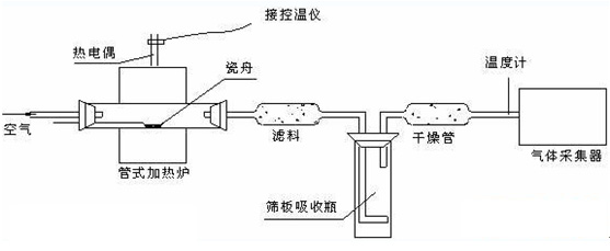 污泥焚燒試驗(yàn)是在內(nèi)徑為Φ70 mm的小型石英管式爐進(jìn)行,圖1為石英管式爐簡圖?諝庥娠L(fēng)機(jī)經(jīng)過穩(wěn)壓箱、流量計后進(jìn)入管床。加熱爐可以準(zhǔn)確控制爐溫,進(jìn)樣量少,可以連接附屬裝置等,在此裝置中可同時進(jìn)行其他實(shí)驗(yàn)研究。主要研究污泥焚燒過程中添加物對重金屬鉛分布的影響。