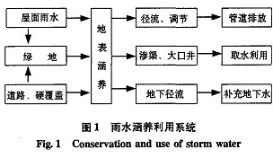 中國(guó)現(xiàn)行《室外排水設(shè)計(jì)規(guī)范》的著眼點(diǎn)是排除雨水,沒有考慮雨水利用。國(guó)家雖大力提倡雨水利用,但目前的雨水利用僅限于直接利用水池、池塘、薄膜防水結(jié)構(gòu)收集儲(chǔ)存雨水,投資大,水量小,實(shí)效差。美國(guó)的經(jīng)驗(yàn)表明,雨水涵養(yǎng)利用可以提高雨水利用水平,發(fā)揮利用雨水、涵養(yǎng)地下水、初雨水凈化等多方面作用,還可以減少雨水排水系統(tǒng)的造價(jià)。在借鑒美國(guó)經(jīng)驗(yàn)的基礎(chǔ)上,作者設(shè)計(jì)了適合中國(guó)國(guó)情的雨水涵養(yǎng)利用系統(tǒng)(圖1),具體做法是:雨水首先盡可能地進(jìn)入地表土壤涵養(yǎng)層涵養(yǎng)儲(chǔ)存。涵養(yǎng)飽和后多余的雨水經(jīng)過地面徑流和洼地、湖塘等調(diào)節(jié),然后通過管道排放。涵養(yǎng)水一部分補(bǔ)充地下水,一部分通過滲渠和大口井取水利用。實(shí)踐證明:該系統(tǒng)方法簡(jiǎn)單易行,雨水利用量大,效果好,值得推廣應(yīng)用。