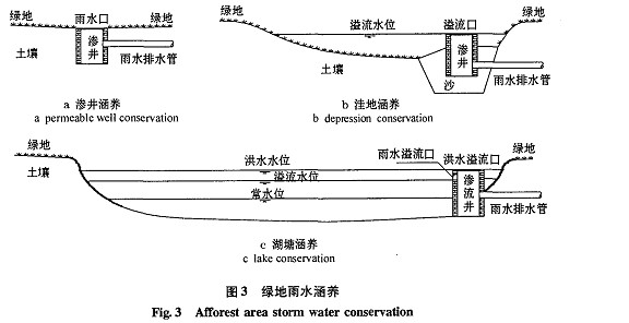 初雨水淋洗空氣和沖刷地面,含有大量污染物,是水環(huán)境的重要污染源之一,城鎮(zhèn)初雨水凈化也是水環(huán)境保護(hù)的重要課題。目前,我國(guó)初雨水凈化尚屬空白。本研究中設(shè)計(jì)的雨水涵養(yǎng)系統(tǒng)是非常簡(jiǎn)單、實(shí)用、穩(wěn)定、經(jīng)濟(jì)的初雨水凈化方法。凈化過程主要有:1)土壤涵養(yǎng)凈化,通過土壤的過濾、吸附和生物降解作用,凈化初雨水;2)植物凈化,通過植物生長(zhǎng),吸收去除污染物;3)自然沉淀,通過洼地和湖塘自然沉淀,去除懸浮物和部分其它初雨水污染物;4)滲透過濾,通過滲井的滲透過濾作用去除污染物。