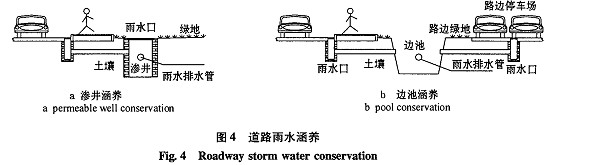 2.3道路、硬覆蓋排水與涵養(yǎng)道路和硬覆蓋雨水首先盡可能地進(jìn)人土壤涵養(yǎng)和人工涵養(yǎng)結(jié)構(gòu)進(jìn)行涵養(yǎng)、儲(chǔ)存、調(diào)節(jié)、凈化,多余雨水溢流排放。道路和硬覆蓋雨水涵養(yǎng)有路邊滲井涵養(yǎng)、邊池涵養(yǎng)、邊溝涵養(yǎng)、轉(zhuǎn)移涵養(yǎng)等基本形式,如圖4所示。