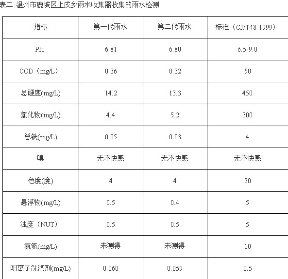 2006年7月溫州市鹿城區(qū)安裝了9套第一代雨水收集器,1套第二代雨水收集器,并與2007年10月10日對(duì)試點(diǎn)用戶進(jìn)行采樣檢測。
