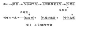 該廠內(nèi)的水池利用起來(lái)存儲(chǔ)雨水,再把這些雨水經(jīng)過(guò)沉淀和過(guò)濾處理就可以應(yīng)用了。為了提高水池的利用率和降低投資,我們把沉砂池,調(diào)節(jié)池和過(guò)濾池合為一個(gè)水池,具有以上的綜合功能。但由于雨水的收集過(guò)程中會(huì)被污染,同時(shí)存在多種細(xì)菌,所以這需要用生物處理的方法以去掉污染物和細(xì)菌。雨水處理工藝流程如圖: