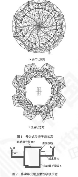 目前世界上大多數(shù)開合式屋蓋的開合方式多為水平移動和空間移動方式,它們是平行移動,空間軌跡移動或跌蓋單元屋蓋的形式打開屋蓋,其屋蓋大多由固定不動結(jié)構(gòu)單元和可移動結(jié)構(gòu)單元組成,這類屋蓋雨水的收集和排放比較簡單,它只要將可移動單元屋蓋的雨水收集至固定不動單元屋蓋的雨水天溝內(nèi),在通過屋面雨水斗和管道有組織的排至室外雨水檢查井即可。