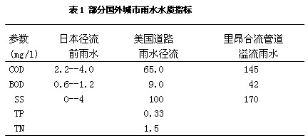 雨水在降落過(guò)程中,空氣中的溶解性氣體,溶解或懸浮狀固體,重金屬及細(xì)菌等會(huì)進(jìn)入其中。地表徑流中的污染物主演來(lái)自降雨對(duì)地表的沖刷。所以地表沉積物是地表徑流中污染物的主要來(lái)源。地表沉積物的組成決定著地表徑流污染的性質(zhì)。地表沉積物包括許多污染物質(zhì),有固態(tài)廢棄物碎屑(城市垃圾、動(dòng)物糞便、城市建筑施工場(chǎng)地堆積物)化學(xué)藥品(草坪施用的化肥農(nóng)藥)、車輛排放物等。具有不同土地使用功能的地表其沉積物的來(lái)源不同。因而,雨水的水質(zhì)會(huì)因地點(diǎn)、時(shí)間的不同而有所差異。一般雨水水質(zhì)主要考慮BOD、 COD 、SS 、TN等的濃度。表1為國(guó)外部分城市雨水水質(zhì)指標(biāo)。