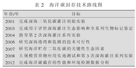 以美國為例,美國于2000年開始由美國能源部主持正式開展CO2封存研究和發(fā)展項目,其中將地質(zhì)封存和海洋封存列為主要研究領(lǐng)域,同時研究陸地生態(tài)系統(tǒng)(森林、土壤、植被等)對二氧化碳的隔離作用,并制訂了詳細的技術(shù)路線圖,詳情見下表