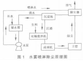 水泥立窯窯尾煙氣沿排煙管到達(dá)水霧噴淋器內(nèi)部, 噴淋噴霧可采用順噴、逆噴、斜噴等方式, 雖然逆噴有利于提高除塵效率, 但逆噴會(huì)對(duì)除塵產(chǎn)生較大阻力, 必須加裝風(fēng)機(jī)引射系統(tǒng)。所以一般采用順噴;宜蛛x器為重力沉降與布袋過濾, 布袋內(nèi)側(cè)的粉塵落入分離器底部, 再入雙軸攪拌機(jī)內(nèi)與水泥生料混合攪拌進(jìn)入成球機(jī)中成球。溢流的清水則返回儲(chǔ)水箱中, 由水泵繼續(xù)輸向噴嘴循環(huán)使用。