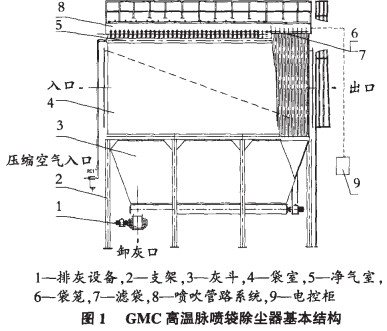 GMC高溫脈噴袋除塵器的基本結(jié)構(gòu)如圖 1。其結(jié)構(gòu)主要有支架、袋室(有袋籠和濾袋)、灰斗、噴吹管路和控制系統(tǒng)等組成。