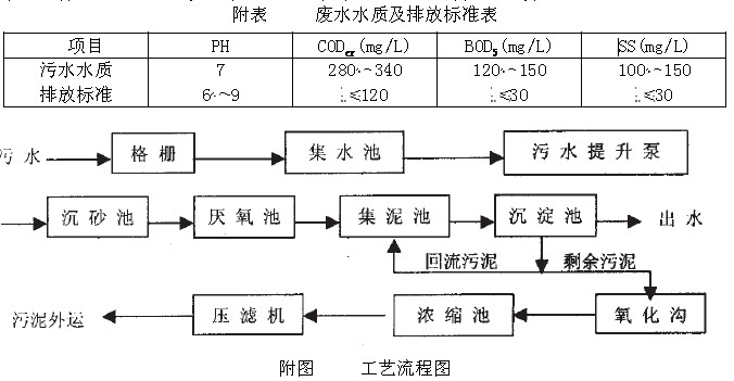 管道收集來的污水經(jīng)格柵去除水中較粗大的固體雜質(zhì)后進入集水池,用污水泵將集水池內(nèi)的污水提升到沉砂池,經(jīng)布水后污水流速減慢,分布均勻,便于去除污水中的比較大的無機顆粒及一些有機物質(zhì),污水經(jīng)過除砂處理后流進厭氧池,在池中厭氧菌及兼性菌的作用下使污水中的大分子難降解的有機物分解成易降解的小分子有機物,非溶解性有機物分解成溶解性有機物,提高了污水的可生化性。污水經(jīng)厭氧池處理后進入氧化溝,在好氧菌的作用下通過曝氣充氧使污水中的有機物分解成為簡單的無機物(CO2 H2O NH3 NO3- PO4- 等)。 氧化溝內(nèi)的混合液一部分進入沉淀池,進行固液分離,上清液由集水管收集后流出,而沉淀下來的污泥一部分回流到氧化溝內(nèi),一部分作為剩余污泥由人工排泥管排入集泥池中經(jīng)重力濃縮池和壓濾機作用后外運作為肥料使用。