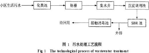 生活污水經(jīng)化糞池溢流通過格柵,經(jīng)集水井通過提升泵進入沉淀調(diào)劑池,經(jīng)沉淀調(diào)節(jié)后的出水,由泵提升進入SBR池,出水排放(或部分經(jīng)過接觸消毒后回用) , 污泥由污泥泵從沉淀池和SBR池一起打入污泥池,濃縮、脫水后外運處理。此工藝設(shè)計具有占地面積小、投資少、管理簡單等優(yōu)勢被業(yè)主選用,其進、出水主要指標見表1。
