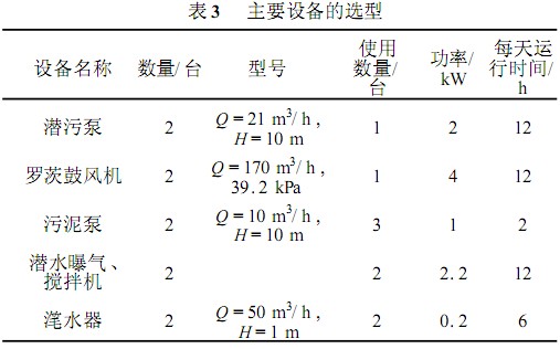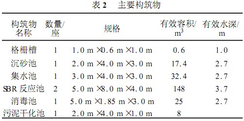 (5)污水處理站自動(dòng)化程度高 ,系統(tǒng)按設(shè)定的工作參數(shù)進(jìn)行工作 ,便于管理 ,處理效果好。主要構(gòu)筑物見表2。主要設(shè)備的選型見表3。