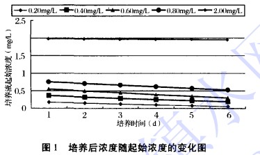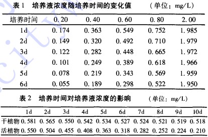 配制一系列培養(yǎng)溶液,濃度分別為0.20、0.40、0.60、0.80、2.00mg/L,分別置于5個相同尺寸的培養(yǎng)缸中,并移人2株生長旺盛的植物樣本,每天固定時間取樣分析,連續(xù)6d。所得結(jié)果見表1。